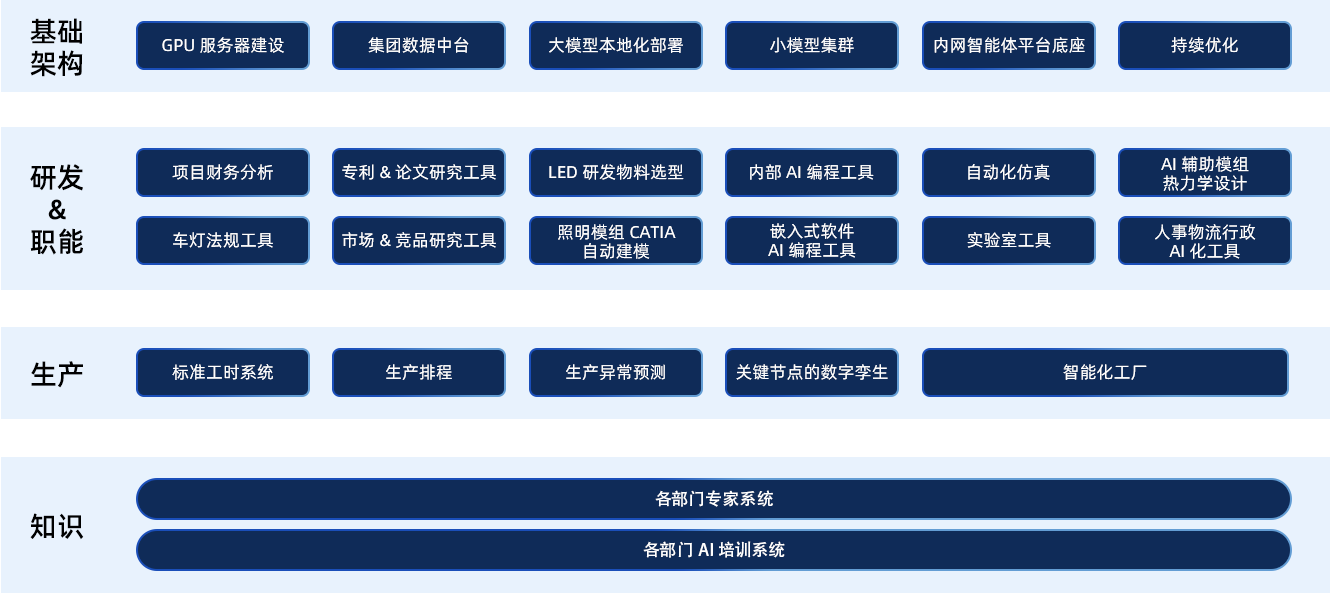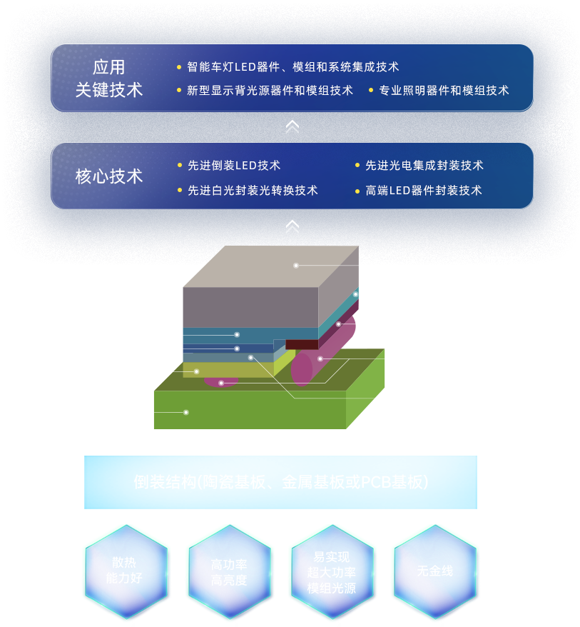 作为融合「LED+」技术的智能视觉产品及系统解决方案提供商,晶科电子构建了完整的技术生态体系,业务覆盖汽车智能视觉、新型显示及高端照明三大领域,以「LED+」技术创新为核心驱动力,深度融合集成电路、电子控制、软件算法、传感器及光学系统等前沿技术,开发了具有市场竞争力的系列产品,包括车规级 LED 器件、汽车电子模组、车载背光模组、智能车灯系统及 HUD;新型高色域薄型化背光源器件和模组、新型 Mini LED 器件和模组;高端户内外照明、智能照明、植物照明和 UV/IR 等特种照明器件和模组等。依托「LED器件-模组-系统」全产业链垂直整合,形成了从半导体封装、光学系统到终端应用的全产业链布局。
